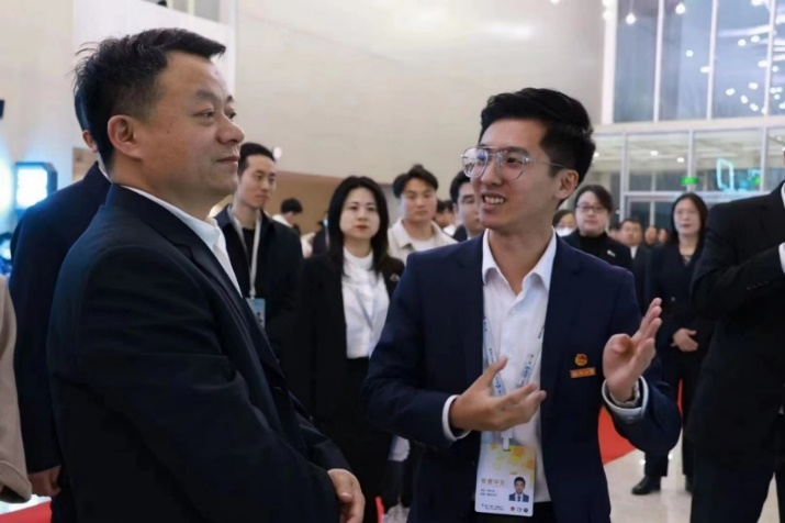 金奖项目负责人黄宇洲向共青团中央书记处书记傅振邦汇报项目成果