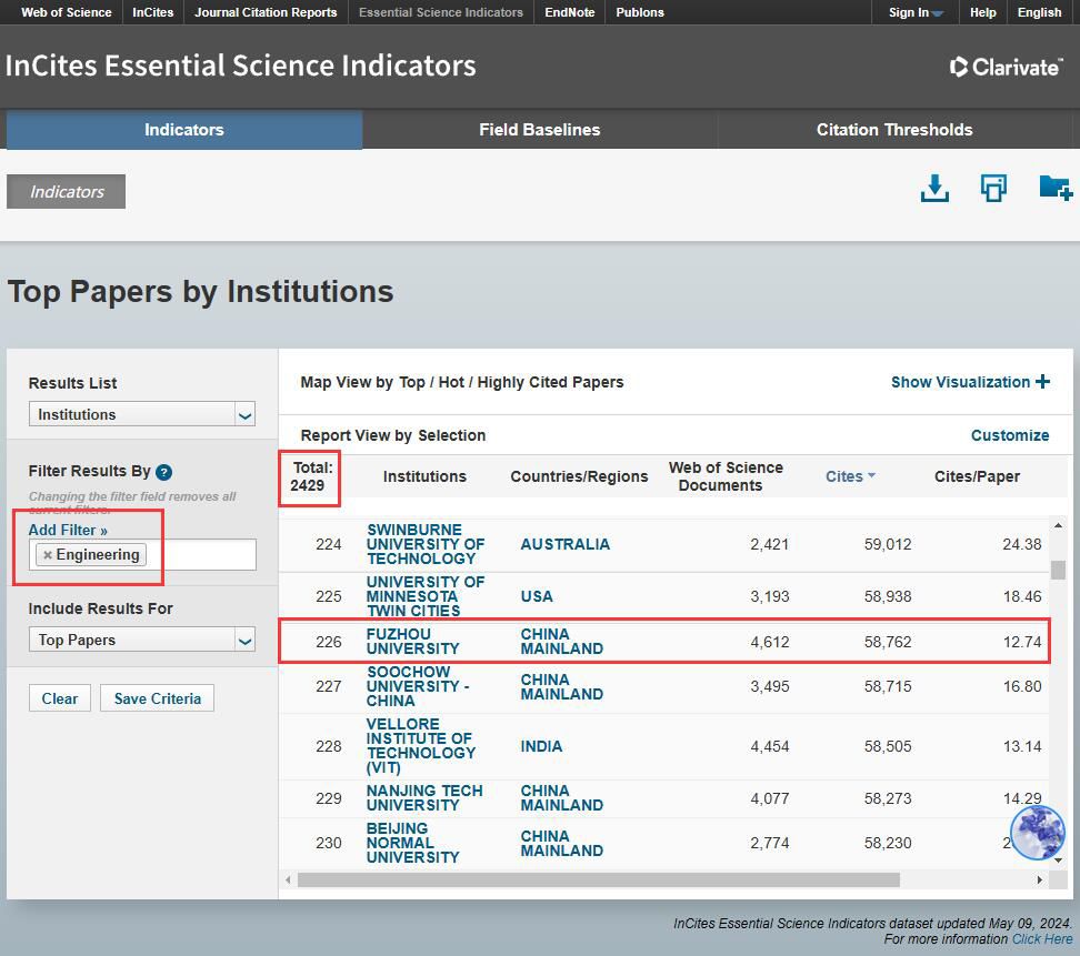 融媒中心讯/根据科睿唯安2024年5月9日更新的ESI数据显示,福州大学工程学学科首次进入ESI全球前1‰行列,所处千分位为0.930‰,总被收录论文为4612篇,总被引数为58762次,全球排名前进23名,位居第226名,国内排名位居第58名。这是我校继化学学科之后,第二个进入ESI全球排名前1‰的学科,与我校以工为主、理工结合的办学理念相契合,也是我校第二轮“双一流”建设阶段性成果。